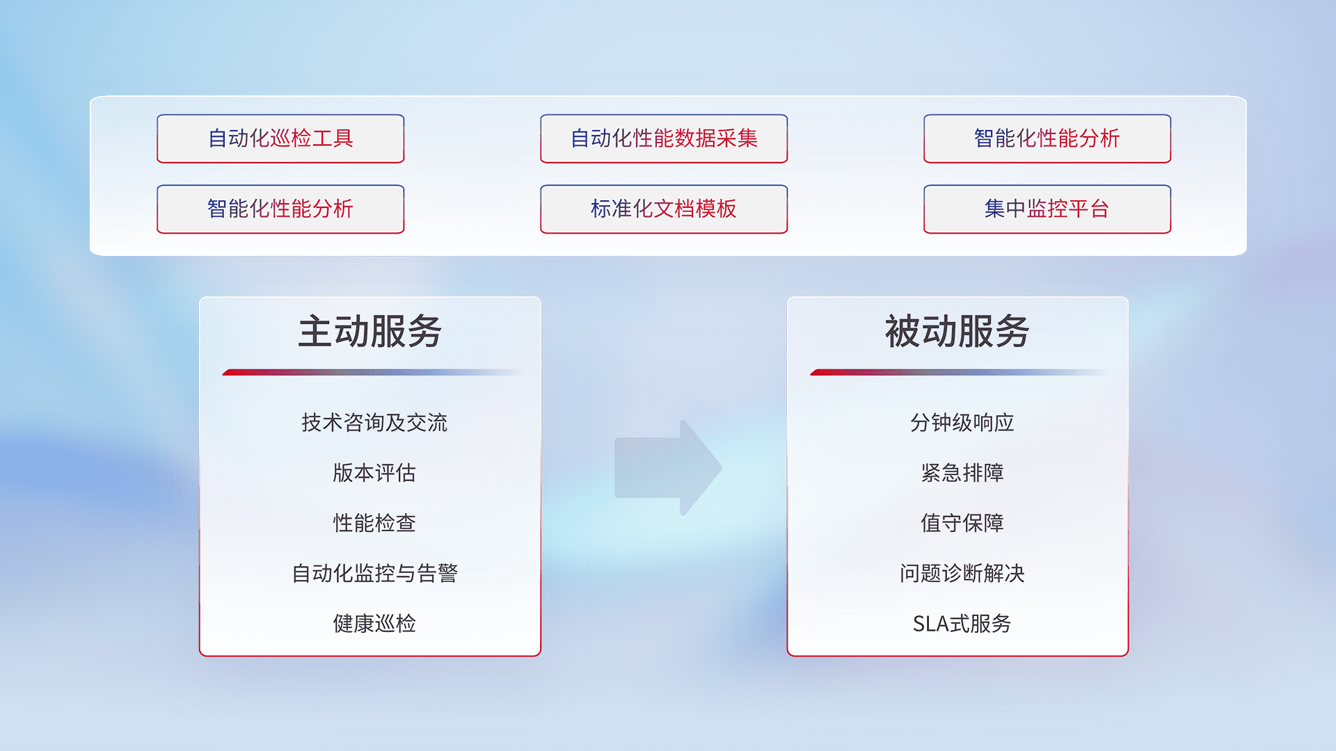 智能化工具和标准化文档,,,,保障服务质量,,,提供主动服务(包含技术咨询、、版本评估、、性能检查、、自动化监控与告警、、、、健康巡检)和被动服务包含(分钟级响应、、紧急排障、、、、值守保障、、问题诊断解决、、、、SLA服务)。。